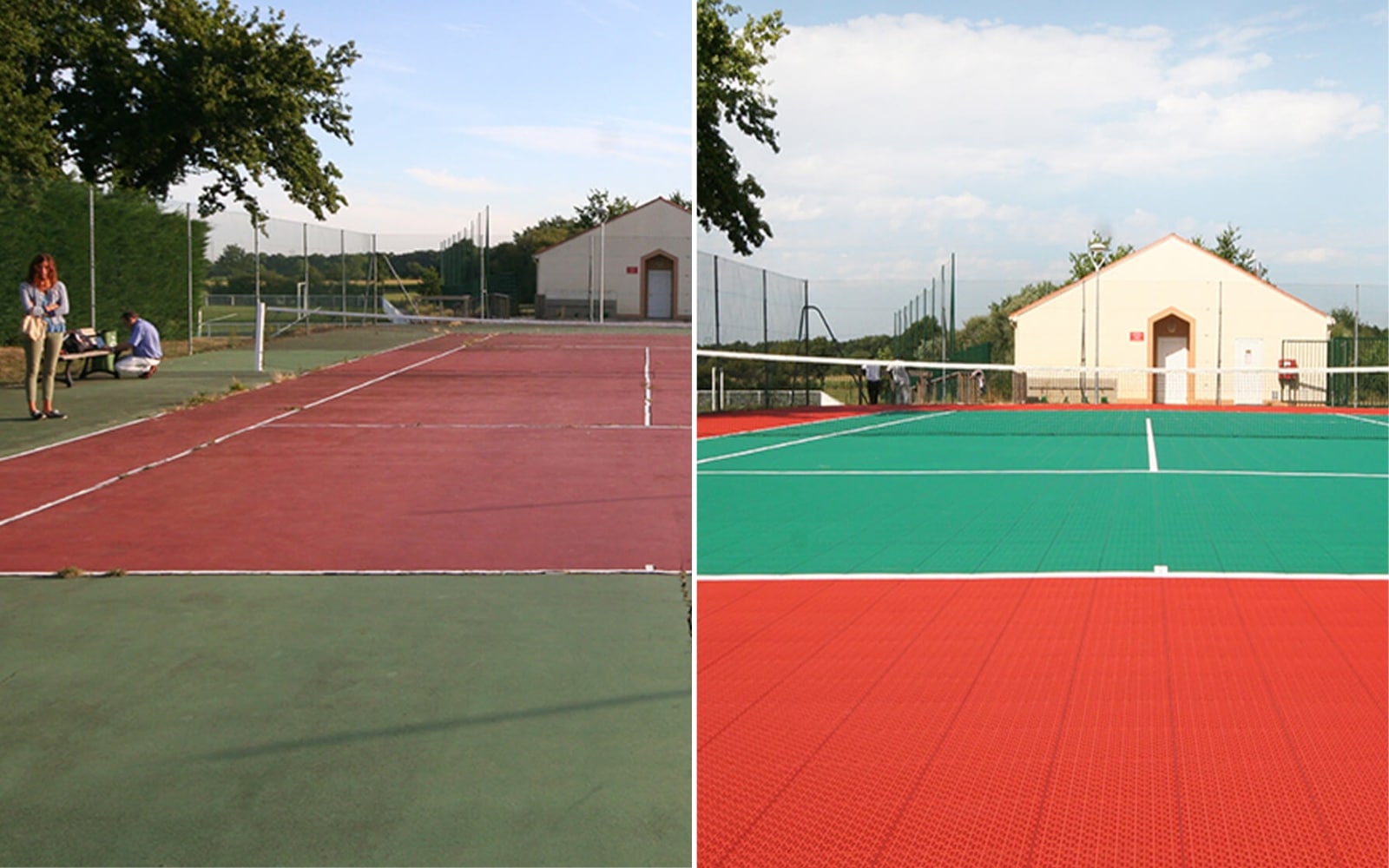 Cette méthode consiste à recouvrir le terrain avec des dalles en PVC clipsables, qui s'emboîtent les unes aux autres pour former une surface de jeu homogène. Cela permet de rénover rapidement et facilement un court sans avoir à attendre que la nouvelle couche de revêtement sèche. Les dalles peuvent également être retirées et réutilisées si nécessaire pour un autre événement ou une autre surface de jeu. C'est une solution idéale si le terrain est fortement endommagé. Les dalles clipsables présentent de nombreux avantages pour le jeu , notamment une bonne absorption des chocs et une surface antidérapante. Elles sont également faciles à entretenir et résistantes aux intempéries.