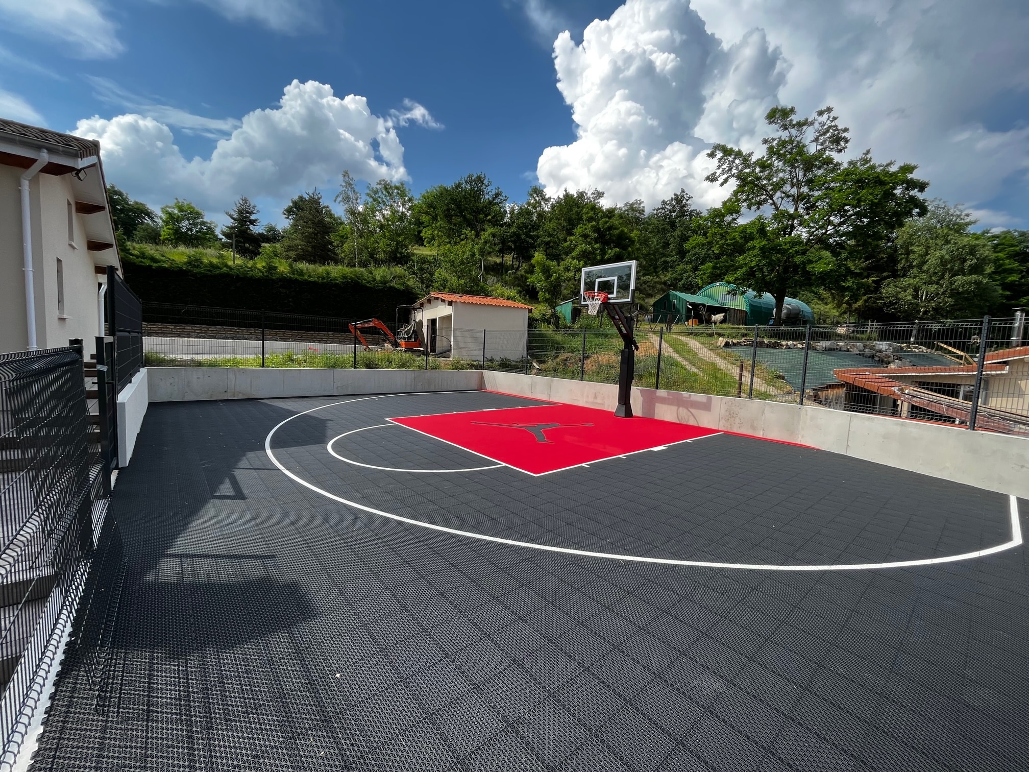 Nous proposons également des accessoires adaptés : paniers de basket réglables, bordures de finition, bancs, filets pare-ballons, pour créer un véritable espace sportif chez vous.